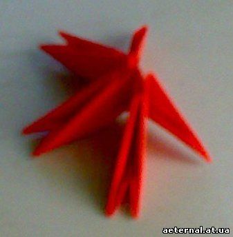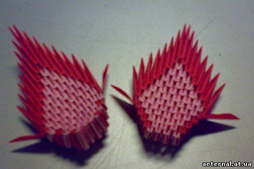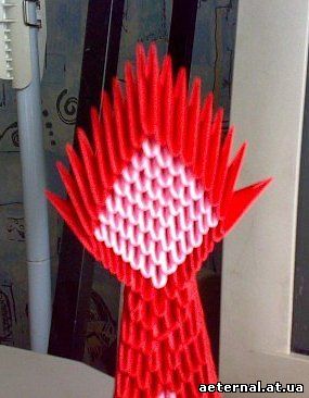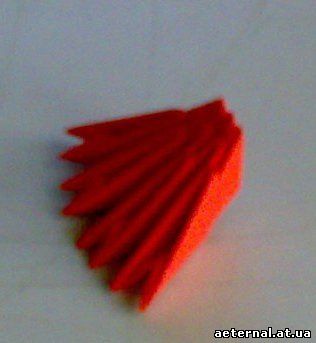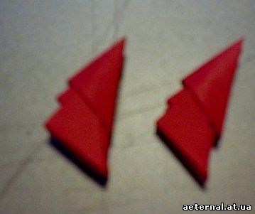 Во 2 ряду берем три красных и крепим с треугольными модулями из первого ряда, а крайние уголки делаем свободными.