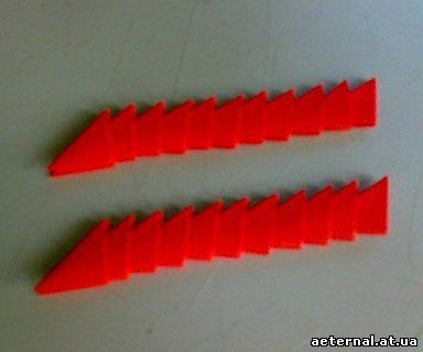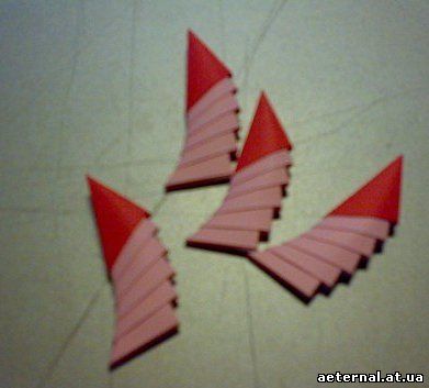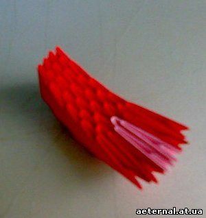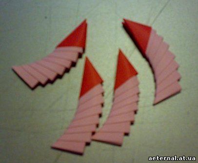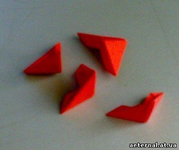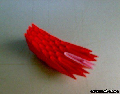 Начинаем собирать лодку.В 1-м ряду берем 4 красных треугольных модуля.